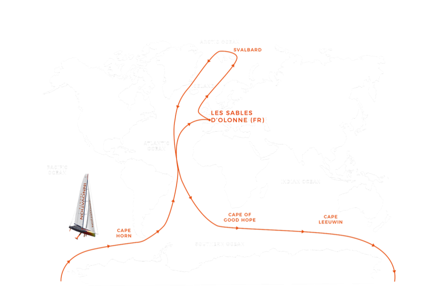 Ensuite, cette tentative de record se poursuivra vers le sud, à travers tout l’Océan Atlantique pour finalement contourner l’Antarctique dans l’Océan Austral. Après avoir passé le Cap Horn, le cap est à nouveau vers le nord pour rejoindre la ligne de départ et d’arrivée aux Sables d’Olonne.